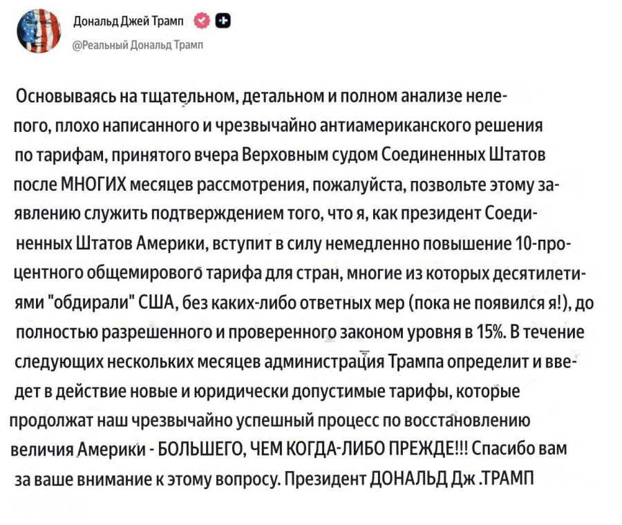 Верховный суд США отменил все тарифы Трампа. По сути выбив из его рук главный козырь. Это серьезно. Очень. Но гораздо серьезнее совсем другое - реакция Трампа на новость. Она изумительна сама по себе, и чревата последствиями для мира: ...