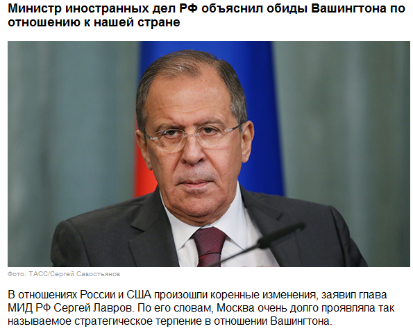 В общем, оказывается, все покладистые реверансы и вся декларируемая "необидчивость", на самом деле, чистая фикция. На самом деле, все обидки, обиды и обидищи учитывались, копились, и вот: вылетели все разом, залпом, как картечь. И непонятно одно. Ведь, казалось бы, ничего принципиально нового, ничего нового Штаты себе не позволяют, гадят в Сирии, на Руине, в международных организациях, и по-крупному, и по мелочам, ровно так, как гадили раньше, и это естественно, ибо Москва, "проявляя стратегическое терпение относительно действий Вашингтона", сама давала США полные на то основания, - так в чем же дело? Почему именно сейчас "в отношениях РФ и США произошли коренные изменения"?!