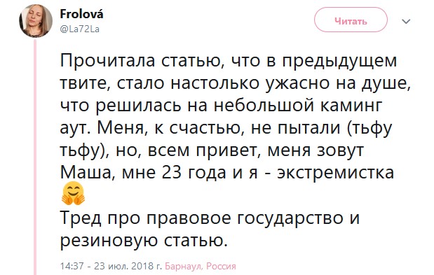 Если вкратце, продолжение тех самых недавних барнаульских историй, где выпускники разных полицейских училищ практикуются в написании обращений на тему экстремизма, которые далее мощно раскручиваются полицией. Ну как раскручиваются - давлением, обманом, прессингом и выбиванием признания. После признания суд и экстремистская статья.