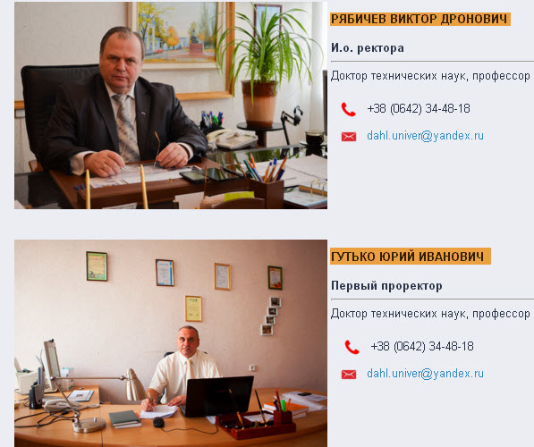 Институт Даля(Машинститут), двое. Рябичев В.Д. и Гутько. Ю.И. оба тащат с рагульской стороны всех бывших. Как обычно распил денежных средств. Говорят одно, делают совсем другое. Расчищают места в институте для перетаскиваемых, методично разваливают систему образования, выстраивая схемы денежных поборов со студентов.