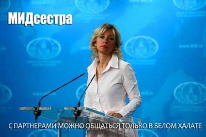 На фотографии Захарова стоит в пресс-центре МИД в белом платье, напоминающем костюм медицинского работника. Изображение дополнено подписью «МИДсестра. С партнерами можно общаться только в белом халате».