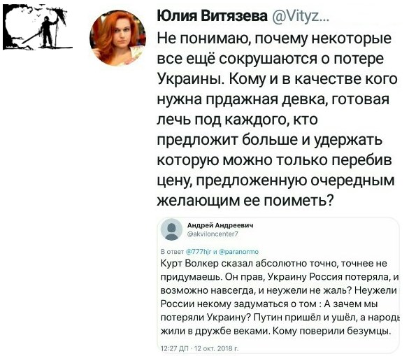 Очередной взблев грязной твари, считающиейся человеком с красивым именем Юля, уважаемый Донрф прокомментировал 13 окт, 2018 в 14:31, а гордое и благородное заявление Москвы по поводу очередных убийств в Донбассе - 14 окт, 2018 в 0:33, то есть, позже, тем самым явно нарушив причинно-следственные связи,