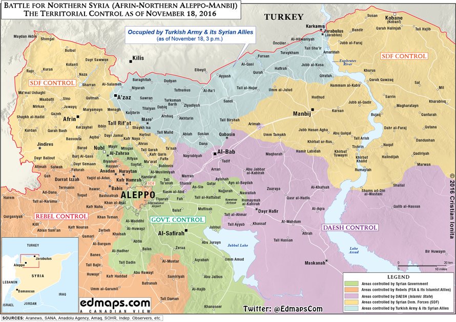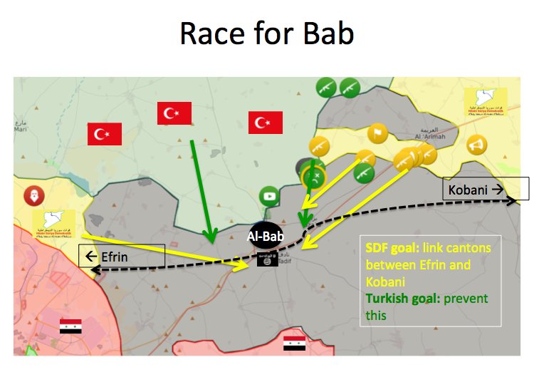Формирования SDF/YPG существенно отстают от темпов продвижения турок, хотя не исключено, что они могут попробовать осуществить соединение курдских территорию к югу от Аль-Баба, смещая ось наступления на юго-восток. При этом, весьма вероятно в ближайшее время может начаться операция САА к северу от Кувейриса и индустриальной зоны Шейх-Наджар, дабы занять часть территории к югу от Аль-Баба в рамках договоренностей с SDF/YPG о распределении сфер влияния к северу от Алеппо.