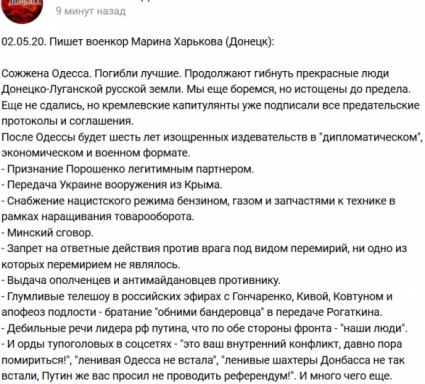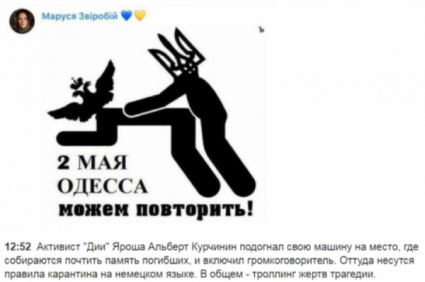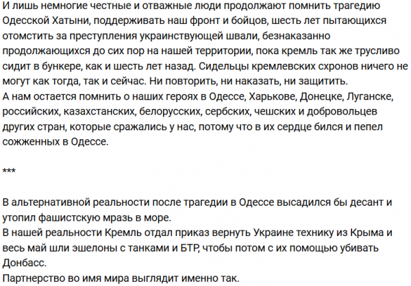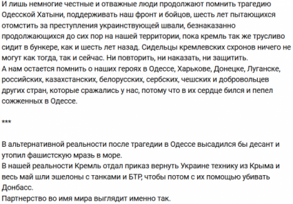 А нам остается помнить о наших героях в Одессе, Харькове, Донецке, Луганске, российских, казахстанских, белорусских, сербских, чешских и добровольцев других стран, которые сражались у нас, потому что в их сердце бился и пепел сожженных в Одессе.