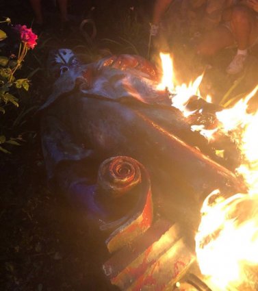 Перед утоплением, памятник завернули в флаг США и подожгли.