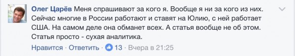 Однопартийцам Тимошенко сказали, что республиканцы недовольны Порошенко, и поэтому давно сотрудничают с Тимошенко. По их рекомендациям Тимошенко взяла на вооружение критику власти по социальным проблемам — высоким коммунальным платежам, невыплате населению банковских депозитов. Они посоветовали заняться развитием партийных структур. И главное, обратите внимание, их требование — отказ от массовых акций, нового майдана в Киеве.