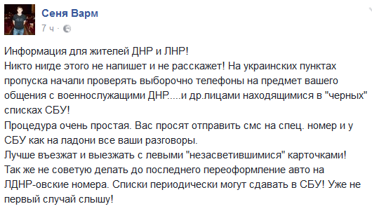 Никто нигде этого не напишет и не расскажет! На украинских пунктах пропуска начали проверять выборочно телефоны на предмет вашего общения с военнослужащими ДНР.....и др.лицами находящимися в "черных" списках СБУ!