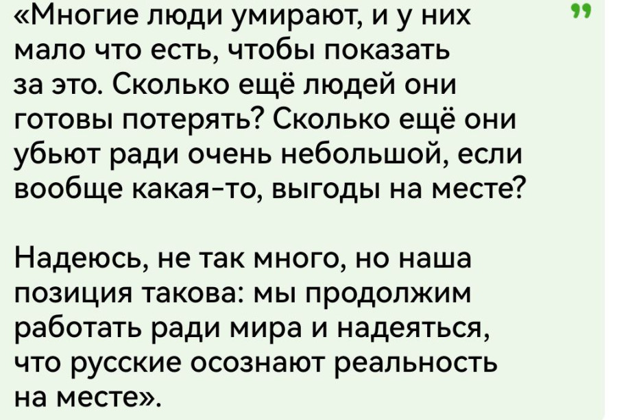 который нужно просто прочитать - заморозка по ЛБС. Как максимум. То есть - серая зона имени Новых территорий, войска НАТО на Украине, обезвоженные Донбасс и Новороссия, неработающая ЗАЭС и куча прочих "плюсов". Понятно, говорим Вэнс, читаем Трамп. Так что - ультиматум Запада. И быстрое сползание к большой войне. К новому крестовому походу Европы драх нах остен. Молдаван и украинцев в основном, но с оружием и офицерами/генералами НАТО.