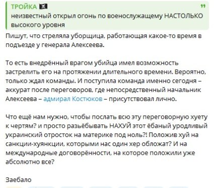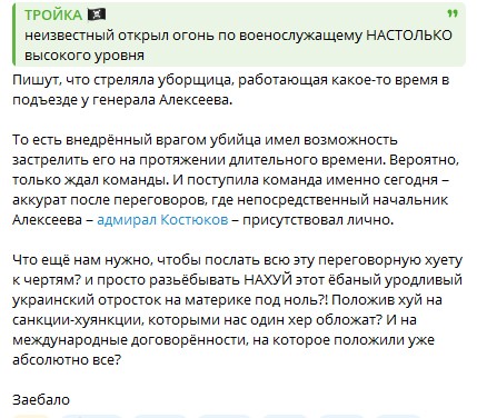 Пишут, что стреляла уборщица, работающая какое-то время в подъезде у генерала Алексеева.