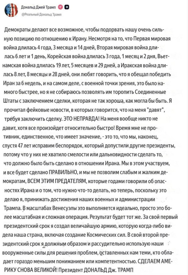 Идет торг. Лютый. Обе стороны хотят максимум. США - весь иранский уран, контроль над Ормузом, слив прокси Ирана и частичный контроль над иранской нефтью через заход американских нефтяных компаний. А еще ограничение Космических сил Исламской республики, гарантии для Израиля и большую уступчивость касательно Китая. При этом какой в Иране режим Трампу плевать. Если он подконтролен США. В этом вся суть американского классического империализма.