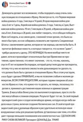 Были когда то времена, когда психопаты лидерами стран не становились. А теперь сам Трамп в ловушке. Судя по истеричному тексту. Война риск, заморозка риск, мировая экономика к чертям летит, переговоры продолжать с позиции слабости тоже риск. Классическая ловушка. С которой выходов то немного, и им мешает раздутое эго. Так что - может быть все. Вообще все. Впрочем как и у нас. Где ситуация накалена до запредельного. Переговоры то может еще будут - мир вряд ли.