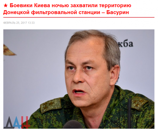«Сегодня ночью украинская сторона, в нарушение всех договоренностей и обязательств, захватила Донецкую фильтровальную станцию... Зная, что наши подразделения придерживаются Минских договоренностей и не открывают огонь по объектам жизнеобеспечения, противник чувствовал свою полную безнаказанность... Мы призываем мировых лидеров… вывести подразделения националистов из зоны «АТО», выполнив письменные гарантии от 15 марта 2016 года».