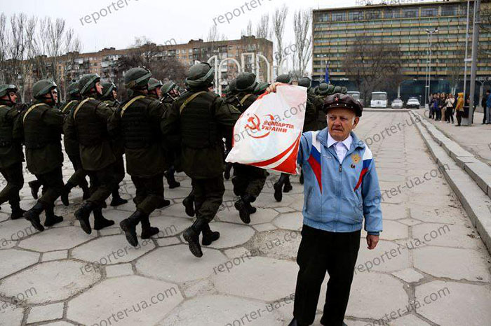 Всё время, пока националисты шли строем, пенсионер держал руку с пакетом поднятой. В местных СМИ эти фото появились с заголовком «В Запорожье во время празднования Дня Нацгвардии был замечен провокатор с коммунистической символикой», в социальных сетях «провокатора» уже назвали героем и самым смелым жителем города.