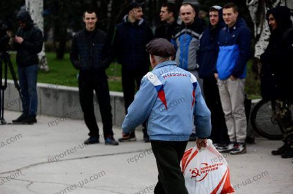 Он вышел перед строем вооруженных нацгвардейцев с теми советскими и российскими флагами, которые у него были. И пусть это всего лишь пакет Компартии Украины и мастерка от спортивного костюма, с флагами мужчина мог просто не дойти до места марша. Но он смело поднял символ СССР, символ, который был начертан на знамени Победы, а на спине у героического деда красовалась надпись «Россия».