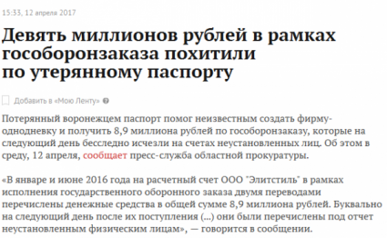 Потерянный воронежцем паспорт помог неизвестным создать фирму-однодневку и получить 8,9 миллиона рублей по гособоронзаказу, которые на следующий день бесследно исчезли на счетах неустановленных лиц. Об этом в среду, 12 апреля, сообщает пресс-служба областной прокуратуры.