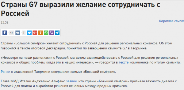 А теперь источник халяльнее некуда, более того, есть и оригинал, и - да! - возрадуйтесь, россияне: страны G7 таки выразили желание сотрудничать с Россией. Несмотря на разногласия. Но только "для решения региональных кризисов и общих проблем, когда это в наших (их!) интересах»,