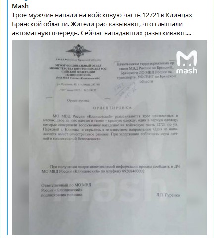 Подробности пока что неизвестны. Но сам факт сомнений не вызывает. А именно то, что в Брянской области, неизвестные, в количестве трех человек, внезапно и на рассвете атаковали воинскую часть с применением нарезного оружия. После чего скрылись, и сейчас на их поиск брошены все силы полиции, ФСБ и армии.