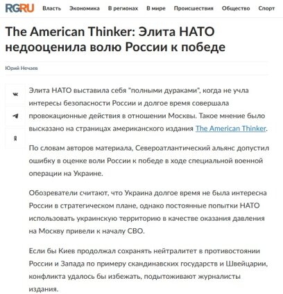 Говорите - НАТО недооценило волю России к победе? Ах - как же так? В чем дело? Может в том, что там генералы-политики, уже в большинстве стали "бледно-синими", бравируют своими содомскими "достижениями" на этом без сомнения скользком поприще, и судят о других по себе? Или в том, что вся эта камарилья, затеяла против РФ по сути войну на уничтожение, о чем российский народ быстро и точно догадался?