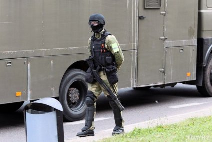 Это белорусский ОМОНовец при исполнении, в той самой Белоруссии где ополченцам не рады и георгиевская лента под негласным запретом, что особенно дико смотрится на лице, так сказать, официальном.